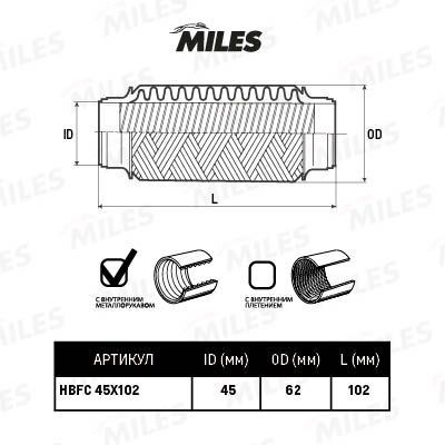 Гофра глушителя (артикул HBFC45X102) — важная и надёжная деталь автомобиля относящаяся к категории Система выпуска. Производится под брендом Miles, известным качеством и долговечностью комплектующих.